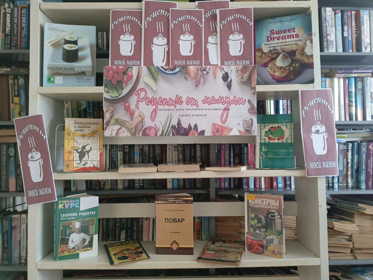 библиотеке к Дню матери оформлена книжная выставка под названием «Рецепты от мамули». Это тематическая выставка, посвящённая кулинарным книгам и сборникам рецептов для мам.